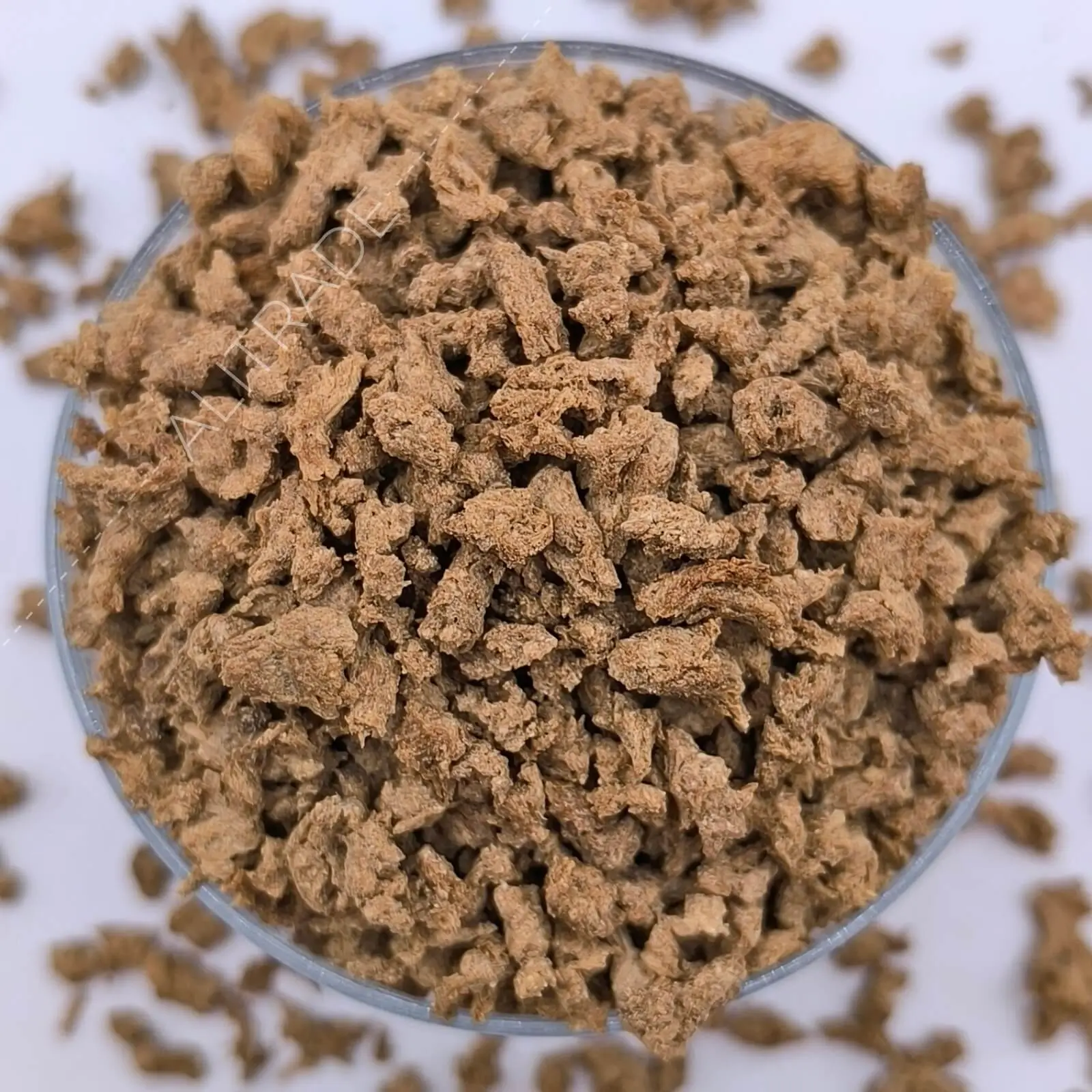 Producto obtenido a partir de la harina desgrasada de soya mediante prensado mecánico y extrusión. Posee una apariencia granular no uniforme de color marrón claro y una textura crujiente similar a la carne cocida. Es un alimento de consumo humano directo con un alto contenido de proteína.